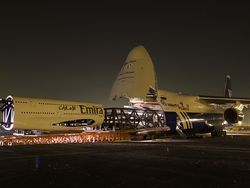 Polet Airlines An-124 nakládá zmenšený model letadla Airbus A380 (2008).