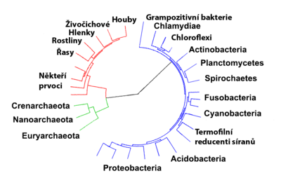 - ↑ 1,0 1,1 Woese C. R., Kandler O., Wheelis M. L. Towards a natural system of organisms: proposal for the domains Archaea, Bacteria, and Eucarya. Proc. Natl. Acad. Sci. U.S.A., 1990, roč. 87, čís. 12, s. 4576–9. Dostupné online. DOI:10.1073/pnas.87.12.4576. PMID 2112744.