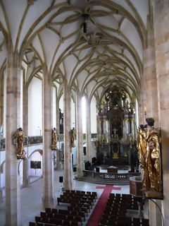 Předchůdcem dnešního kostela byla raně gotická trojlodní bazilika) založená mezi lety 1253 až 1257, jak dokládá nepřímo listina papeže Bonifáce VIII. z roku 1296. Z původního kostela se zachovala jen jeho východní krypta a vnitřní obvodové zdivo západní věže. Kostel vyhořel roku 1515.