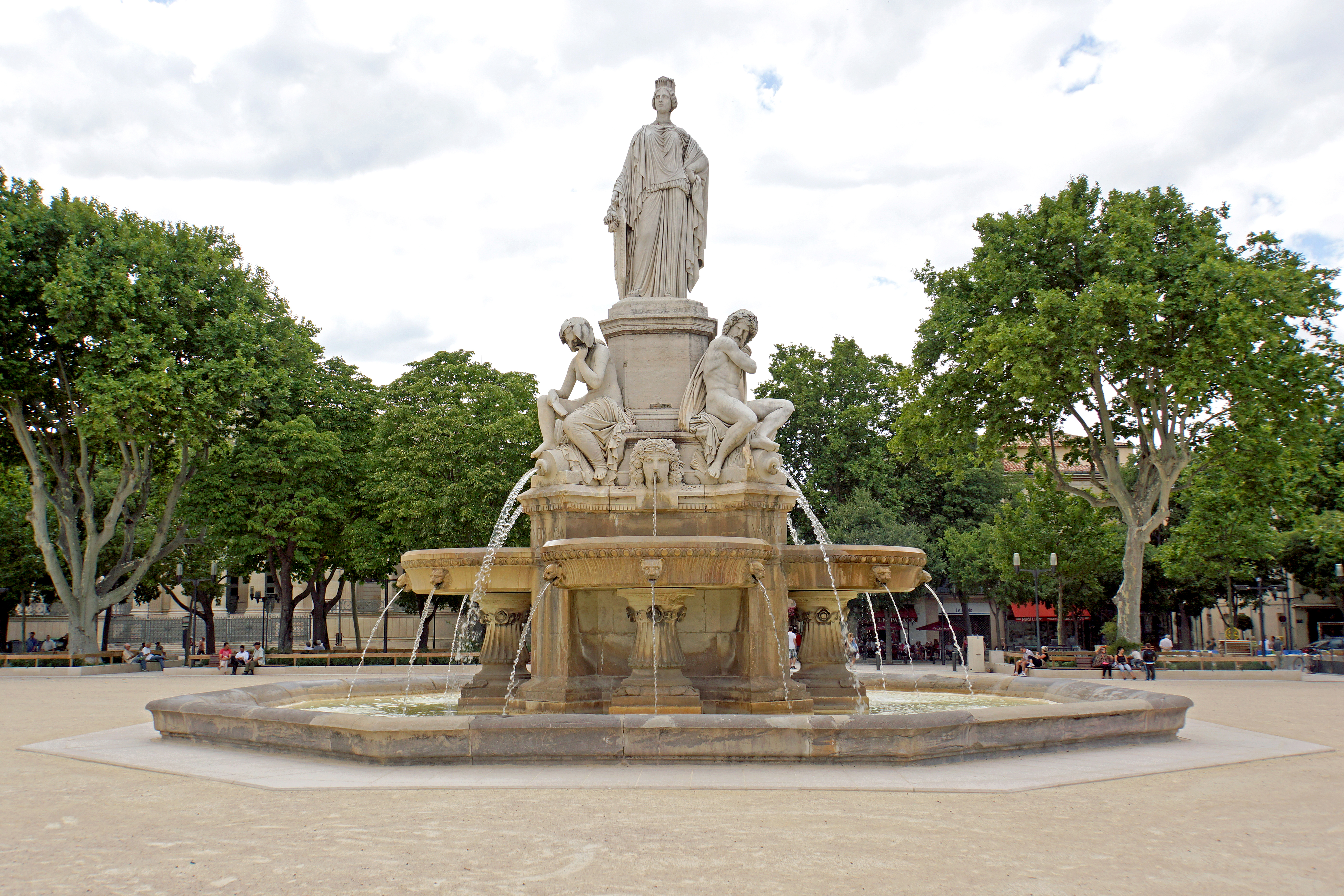 • Fontaine Pradier located in Esplanade Charles de Gaulle in Nimes. The fountains main element, a young woman standing allegorically represents the city of Nimes.