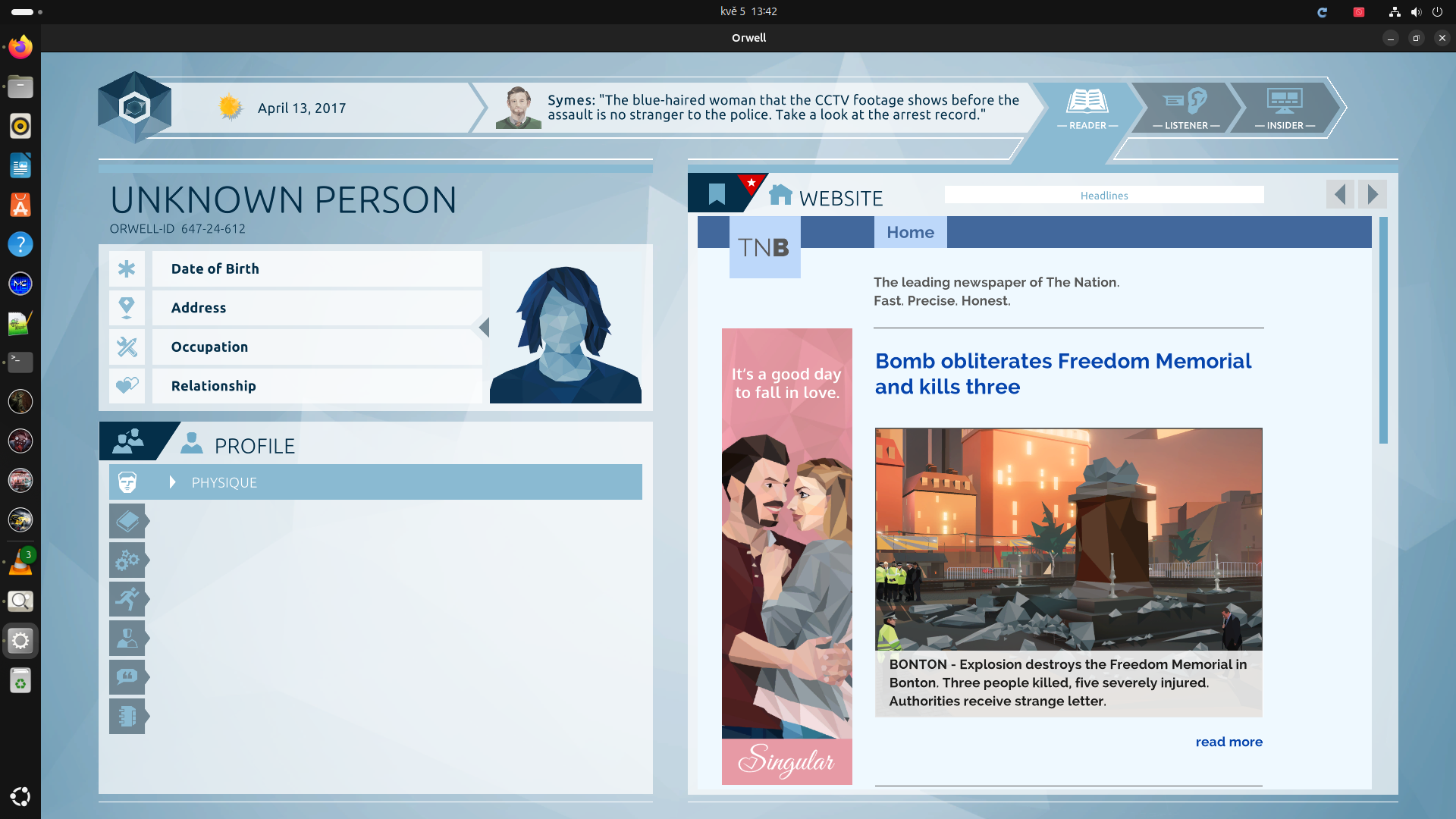 | současná | 5. 5. 2025, 12:40 | 1 920×1 080 (612 kB) | Sysop (diskuse | příspěvky) | (Snímek obrazovky + Czech: grafické prostředí '''Ubuntu verze 24.04.2 Noble Numbat LTS'''...je velmi přitažlivé. * Skvělá hra – '''Orwell''' * GOG.com — '''https://www.gog.com/en/game/orwell''' + pochází z mojí nejlepší pracovní stanice) |