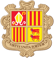 - 1. pole – Zkřížená zlatá mitra a berla na červeném štítu, symbolizující biskupa z La seu d'Urgell.