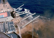 | Plná boční salva americké bitevní lodi | |