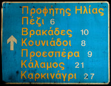 | - | [[Soubor:Griechisches Straßenschild.JPG|thumb| | + | [[Soubor:Griechisches Straßenschild.JPG|thumb|220px|Řecká dopravní směrovací značka]] |
