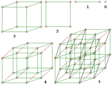 Krychle“ zobrazená v 0 až 5 rozměrech.