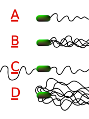 Počet a uspořádání bakteriálních bičíků: A. monotricha, B. lofotricha, C. amfitricha, D. peritricha