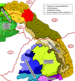 - Ukrajinské vrchy Zachidni Beskydy (nebo Вододільний хребет) (Zakarpatská oblast+Lvovská oblast); podcelky: