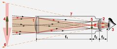 Příkladem konstrukce refraktoru může být tzv. hvězdářský (Keplerův) dalekohled. Tento dalekohled je tvořen dvěma soustavami spojných čoček, které mají společnou optickou osu. Objektiv tohoto dalekohledu má velkou ohniskovou vzdálenost \(f\), ohnisková vzdálenost okuláru \(f_0\) je malá. Obrazové ohnisko objektivu splývá s předmětovým ohniskem okuláru. Obraz velmi vzdáleného předmětu vytvořený objektivem se nachází v ohnisku okuláru, přičemž se jedná o obraz skutečný, zmenšený a převrácený. Tento obraz pak pozorujeme okulárem jako lupou. Obraz však zůstává převrácený i po zvětšení okulárem, což je nevýhoda tohoto typu dalekohledu, která je však pro astronomická pozorování nepodstatná.