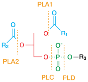- Fosfolipáza A1 – odštěpuje acylový zbytek na C1 pozici glycerolového zbytku[1]