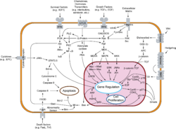 G-proteiny i Ras proteiny jsou příklady GTPáz, jež se účastní složitých vnitrobuněčných kaskád; zde znázorněna kaskáda procesů vedoucích k programované buněčné smrti