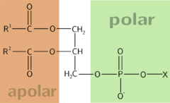 Tato dvojí povaha molekuly způsobuje charakteristické vlastnosti glycerolfosfolipidů. Umožňuje jim vytvářet dvojvrstvy v membránách s polárními hydrofilními hlavami ven do vodního prostředí a nepolárními hydrofobními ocasy směřujícími dovnitř membrány.