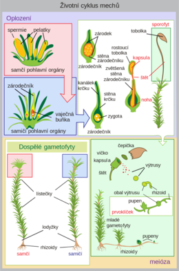 Mechy jsou zelené vyšší, ale necévnaté rostliny malého vzrůstu, s výraznou schopností zadržovat vodu. Většinou preferují vlhká a stinná stanoviště. Také to jsou pionýrské rostliny. V životním cyklu výrazně převládá haploidní gametofyt. Gametofyt, mechová rostlinka, je schopná fotosyntézy a má poměrně složitou stavbu. Stélka je rozlišena na kořínky, příchytná vlákna (rhizoidy), lodyžku (kauloid) a lístky (fyloidy). Mnohobuněčné rhizoidy fixují mechovou rostlinku k podkladu. Lodyžka má již diferencovaná pletiva, nalezneme i jednoduchá vodivá pletiva. Stěna lodyžky je rovnoměrně ztlustlá, pokožka může být pigmentovaná. Je olistěná, lístky jsou zelené a probíhá v nich fotosyntéza. Gametangia, tedy pohlavní orgány, vyrůstají na vrcholu lodyžky. Mechové rostlinky mají oddělená pohlaví. Samčí pohlavní orgány, pelatky (antheridia) produkují dvoubičíkaté spermatozoidy, které se ve vlhkém prostředí aktivně pohybují. Samičí zárodečníky (archegonia) obsahují velkou nepohyblivou vaječnou buňku. Po oplození vzniká na gemetofytu sporofyt. Sporofyt je tvořen nohou, štětem a sporangiem - tobolkou, která produkuje haploidní výtrusy. U rašeliníků a štěrbovek štět chybí. Tobolka má dvoubuněčné průduchy, je vyztužena středním sloupkem (columela), kolem kterého je výtrusorodé pletivo (archesporum). V něm buňky prodělávají meiózu a tvoří se výtrusy. Sporangium je kryté víčkem a čepičkou (kalyptra). Výtrusy dozrávají najednou, ale vypadávají postupně díky obústí, věnci hydroskopických zubů. Obústí je také důležitý systematický znak. Oplození může proběhnout jen v dostatečně vlhkém prostředí (za deště), kdy se spermatozoidy mohou dostat k vaječným buňkám. Po oplození vznikne diploidní zygota, která se vyvíjí ve sporofyt. Ten vyrůstá z vrcholu mateřského gametofytu a je na něm plně závislý.