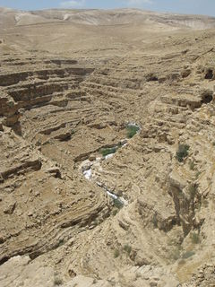 Pokračuje potom k východu zcela neosídlenou pouštní oblasti a klesá strmě do příkopové propadliny Mrtvého moře. Stojí tu čistička odpadních vod, která řeší problémy se splaškovými vodami, které do Nachal Kidron ústí v aglomeraci Jeruzaléma. Dolní úsek vádí je turisticky využíván. Soutěsku z jižní strany ohraničuje vrch Micpe Nachli'el. Podél jižní strany vesnice Avnat pak Nachal Kidron vstupuje do sníženiny u břehu Mrtvého moře, podchází dálnici číslo 90 a ústí do Mrtvého moře.[4][5][6]