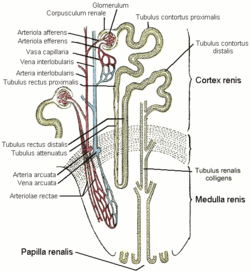 Nefron je základní stavební a funkční jednotka ledviny. Jeho základem je Bowmanovo pouzdro, ve kterém se nachází klubíčko vlásečnic glomerulus, dohromady nazývaných Malpighiho tělísko. Glomerulus je tvořen klubíčkem vlásečnic (přívodná a odvodná tepénka, kde se pomocí hladkého svalstva v cévě řídí tlak ve vlásečnici). Z glomerulů se do Bowmanova váčku odevzdává převážná část kapalných složek (kromě plazmatických bílkovin), zde vzniká tzv. ultrafiltrát(=primární moč, které se za 24 hodin přefiltruje 170 až 200 l. Obsahuje ještě živiny, které se zpětně vstřebávají např. glukoza, a současně dochází k exkreci některých látek, např. léků.) Z Bowmanových váčků vystupují vinuté kanálky prvního řádu , uložené v kůře. Ty pokračují přes stočený kanálek prvního řádu (Proximální tubulus) až do Henleovy kličky (vniká do dřeně a otáčí se zpět do kůry. Henleova klička je místem tvorby hypertonické moči, dochází zde k velké resorbci vody) odkud putují přes stočený kanálek druhého řádu (distální tubulus) dál až k místu, ve kterém ústí do sběrného kanálku. Postupným přefiltrováním vzniká sekundární moč, která se skládá převážně z vody, močoviny a chloridu sodného. Jejich vyústěním jsou kanálky sběrací (silnější). Ty ústí do ledvinové pánvičky (pelvis renalis).