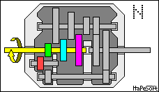 Na obrázku je zjednodušený příklad funkce vícestupňové převodovky. Převodovka má možnost řazení tří rychlostních stupňů v jednom směru a možnot zařazení jednoho zpětného chodu. Převody pro řazení tří rychlostních stupňů jsou označeny zeleně, modře a fialově. Animací je znázorněno, jak se dostávají do záběru jednotlivá přenosová kola a tím se mění otáčky (rychlost) a výkon na výstupní hřídeli. Zpětný chod (reverzace) je značen červeně. Vstupní hřídel je značena žlutě, výstupní hřídel mění barvu podle zařazeného převodu. V obrázku jsou doplněny stavy převodu; rychlosti V1, V2, V3; zpětný chod R; neutrál N. Animace pro zjednodušení neřeší potřebnou synchronizaci a mechanizmus přestavění přenosových kol.
