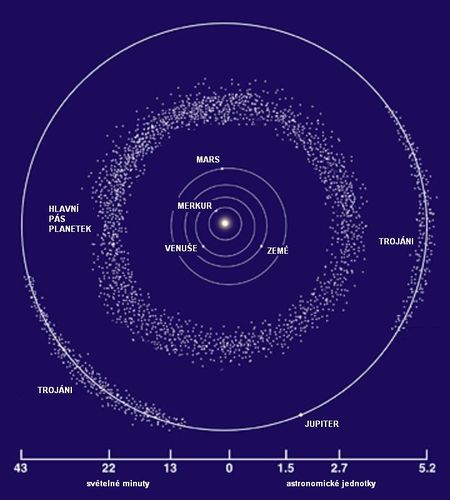 - trojáni – hodnoty velké poloosy jejich drah leží v rozpětí od 5,05 AU do 5,4 AU, pohybují se tedy po přibližně stejné dráze jako Jupiter, v komensurabilitě 1:1. Dynamicky tvoří jednu skupinu, prostorově však rozdělenou do dvou samostatných celků. Jsou totiž seskupeny kolem libračních center L4 a L5 soustavy Slunce-Jupiter. Dostávají jména po hrdinech trojské války, skupina nacházející se kolem bodu L4 po hrdinech řeckého tábora, druhá skupina kolem bodu L5 podle obránců města. Prvním objeveným trojánem byl (588) Achilles;