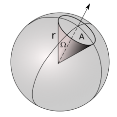 - Steradián je koherentní fyzikální jednotka prostorového úhlu. Jeden steradián je prostorový úhel, který vymezuje ze středu kulové plochy na jejím povrchu plochu o obsahu rovném kvadrátu jejího poloměru.[8] (Definice je obecná, aniž by specifikovala tvar vymezené plochy.) Podobně jako radián, je steradián v současné podobě SI považován za odvozenou bezrozměrnou jednotku, přičemž dříve (do r. 1995) byl řazen do tzv. doplňkových jednotek s vlastním rozměrem.