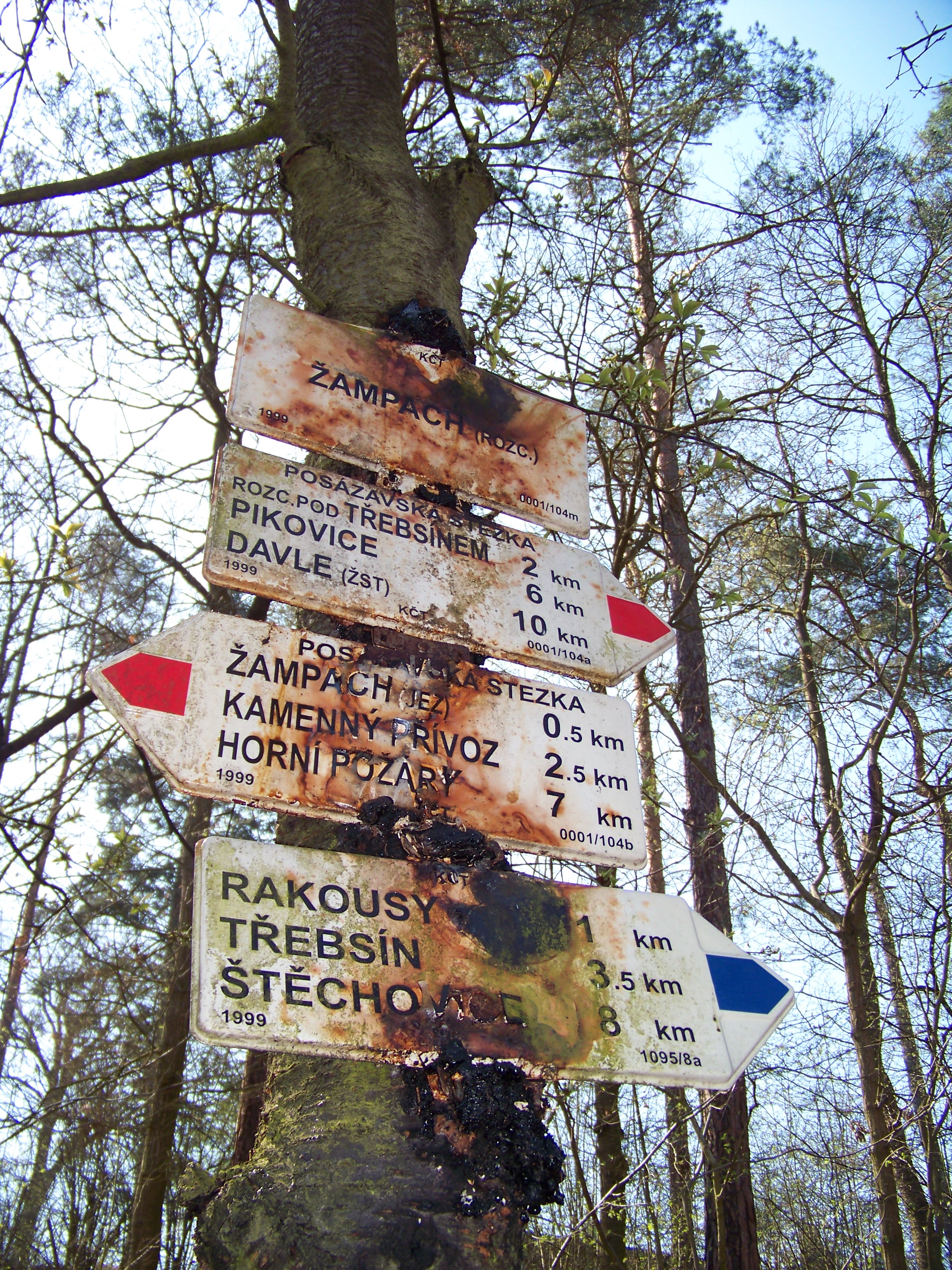 - English: Kamenný Přívoz-Žampach, Central Bohemian Region, the Czech Republic. Hiking signs.
