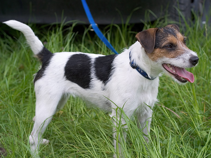 - English: This dog is a rough-coated, tricolor Parson Russell Terrier.
