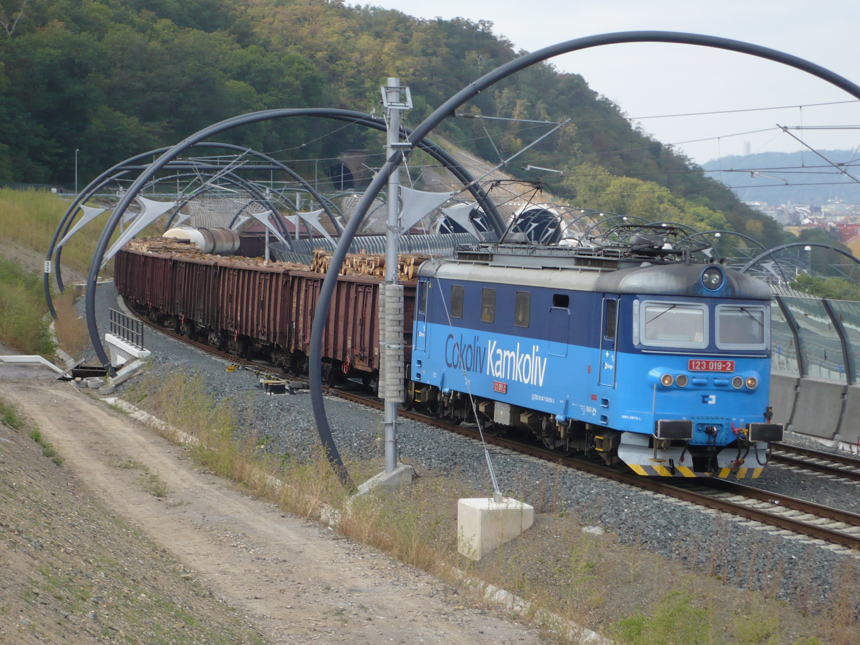 - Česky: Nákladní vlak společnosti ČD Cargo tažený lokomotivou 123 019-2, Nové spojení, Praha. Vlevo portál tunelu původní trati.
