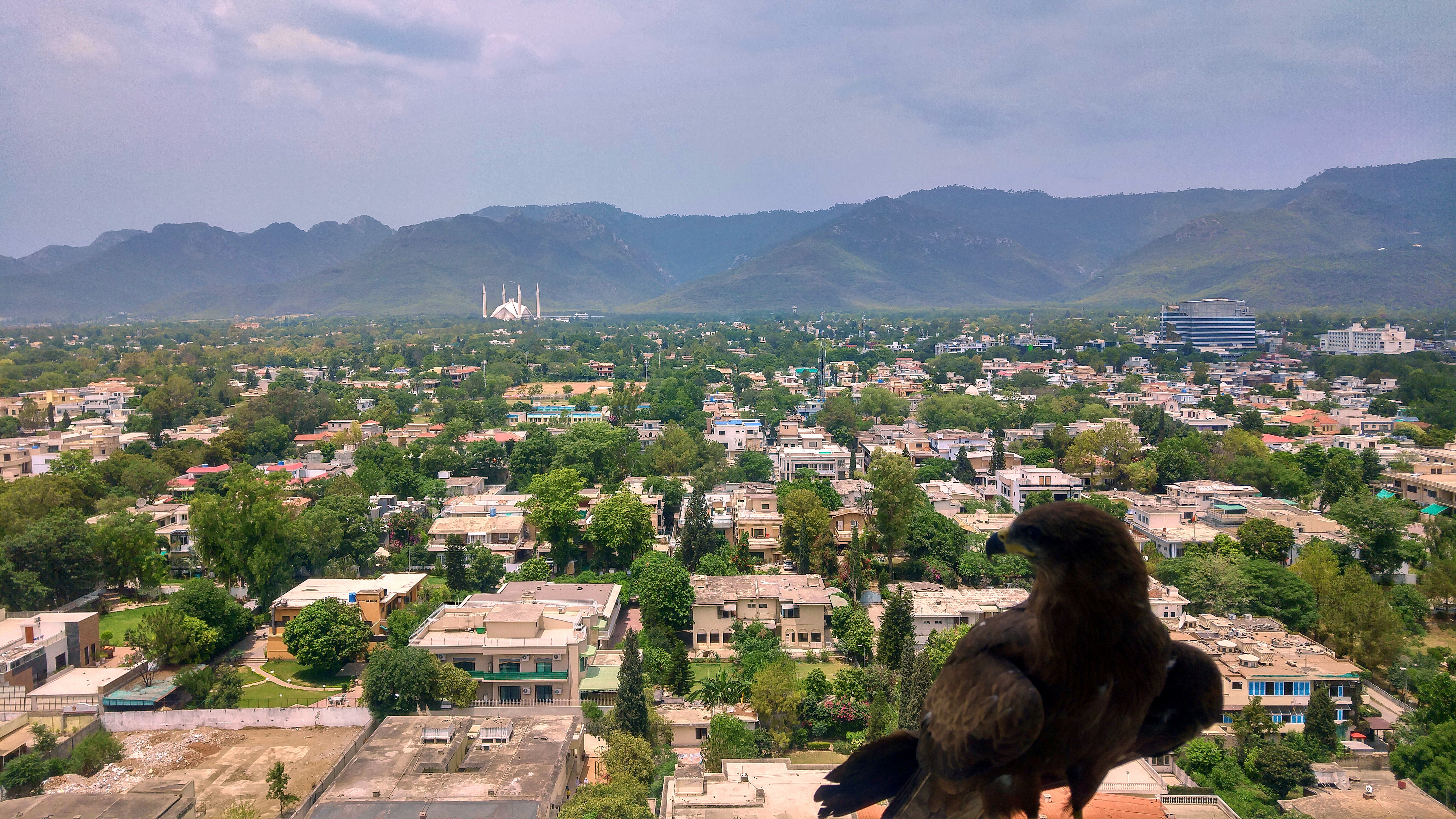 Fotografie + Description: English: A kite looks over Margalla Hills and Faisal Mosque