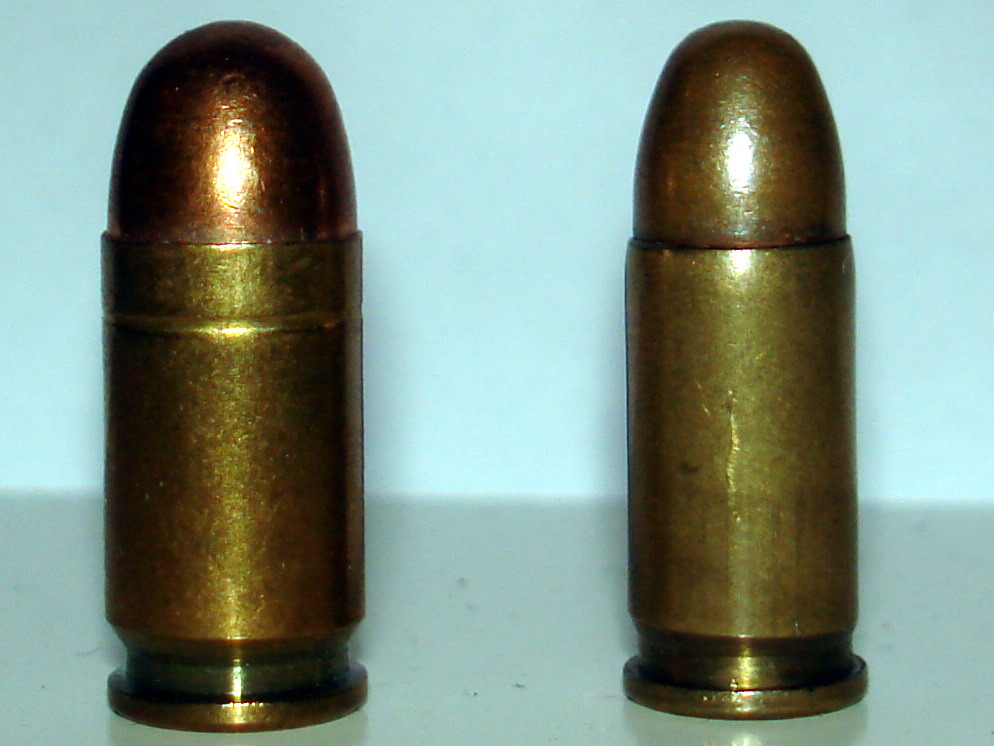 Fotografie + Description: .380 ACP (left), compared to .32 ACP (right). Yugoslavian made, standard FMJ.