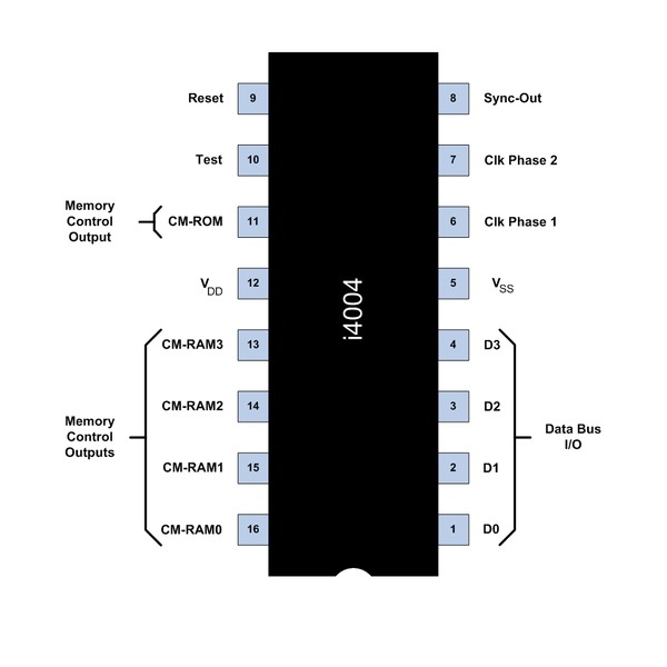 Fotografie + English: Pinout diagram of the Intel 4004 microprocessor