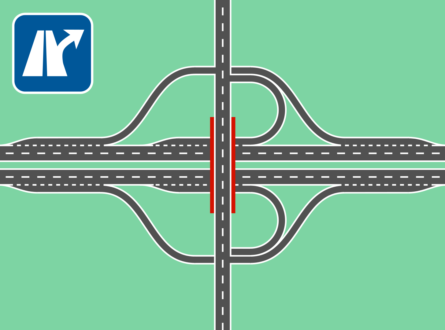 - Deutsch: Autobahnanschlussstelle Teilkleeblatt, 6 Rampen, nach Westen höhenfrei