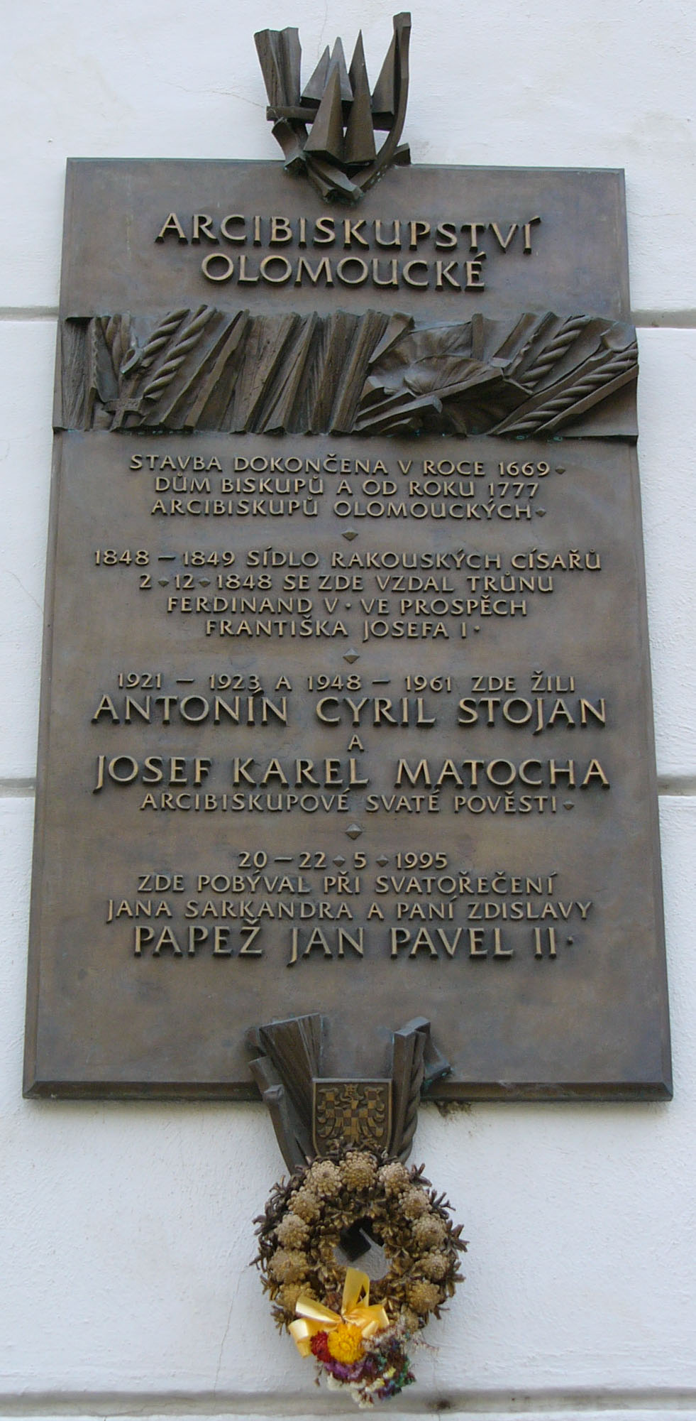 - Čeština: pamětní deska od Otmara Olivy na budově olomouckého arcibiskupství věnovaná Antonínu Cyrilu Stojanovi, Josefu Karlu Matochovi a návštěvě Jana Pavla II.