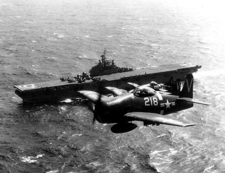 - English: Four Grumman F8F-1 Bearcats of fighter squadron VF-12A Fighting Twelve flying past the aircraft carrier USS Valley Forge (CV-45) on 28 April 1948. The Valley Forge with Carrier Air Group Eleven (CVAG-11) aboard was on a world cruise from 9 October 1947 to 11 June 1948 from San Diego (California, USA) via the Suez and Panama Canals back to San Diego. Grumman TBM Avengers of VA-12A and Curtiss SB2C-5 Helldivers of VA-11A can be seen on deck. VA-12A was re-designated VF-112 on 15 July 1948.