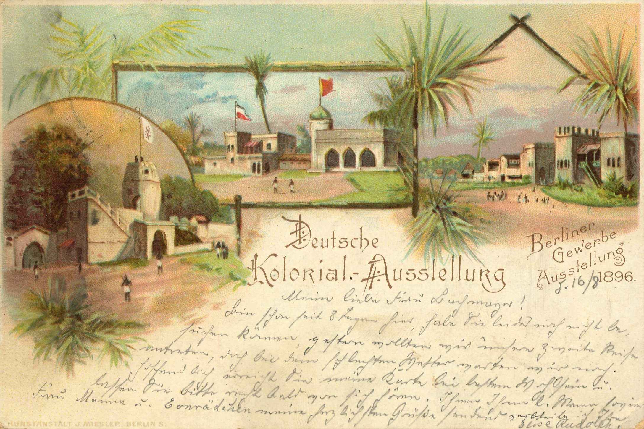 • Deutsch: alte Ansichtskarte zur Berliner Gewerbeausstellung 1896 im Treptower Park - Ansicht der Kolonial-Ausstellung