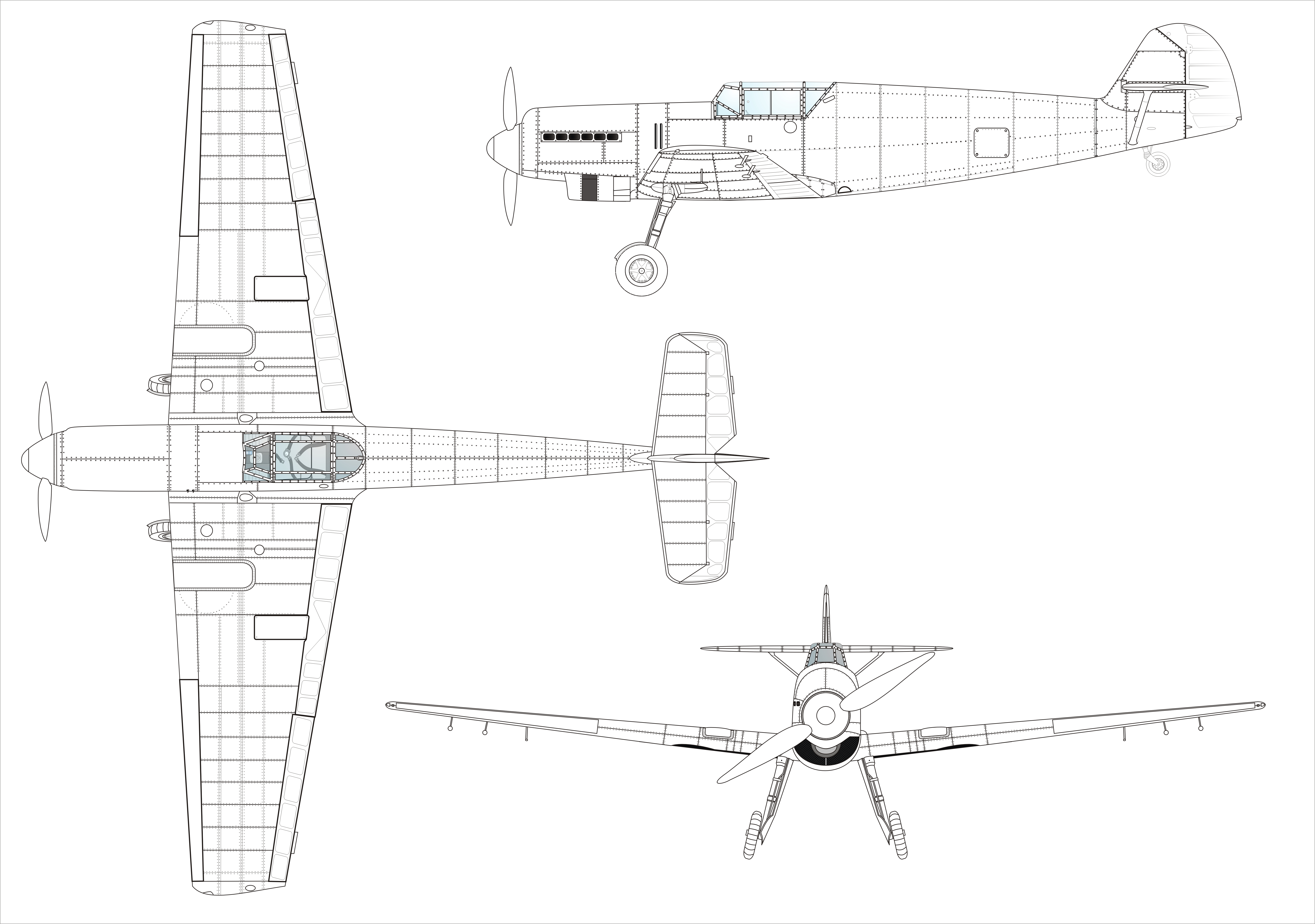Schématický obrázek + Bf 109 V1 (2007-01-31) + pochází z Wikimedia Commons, kde má status – Creative Commons Uveďte autora-Zachovejte licenci 2.0 Německo (autor: B. Huber at de.wikipedia).