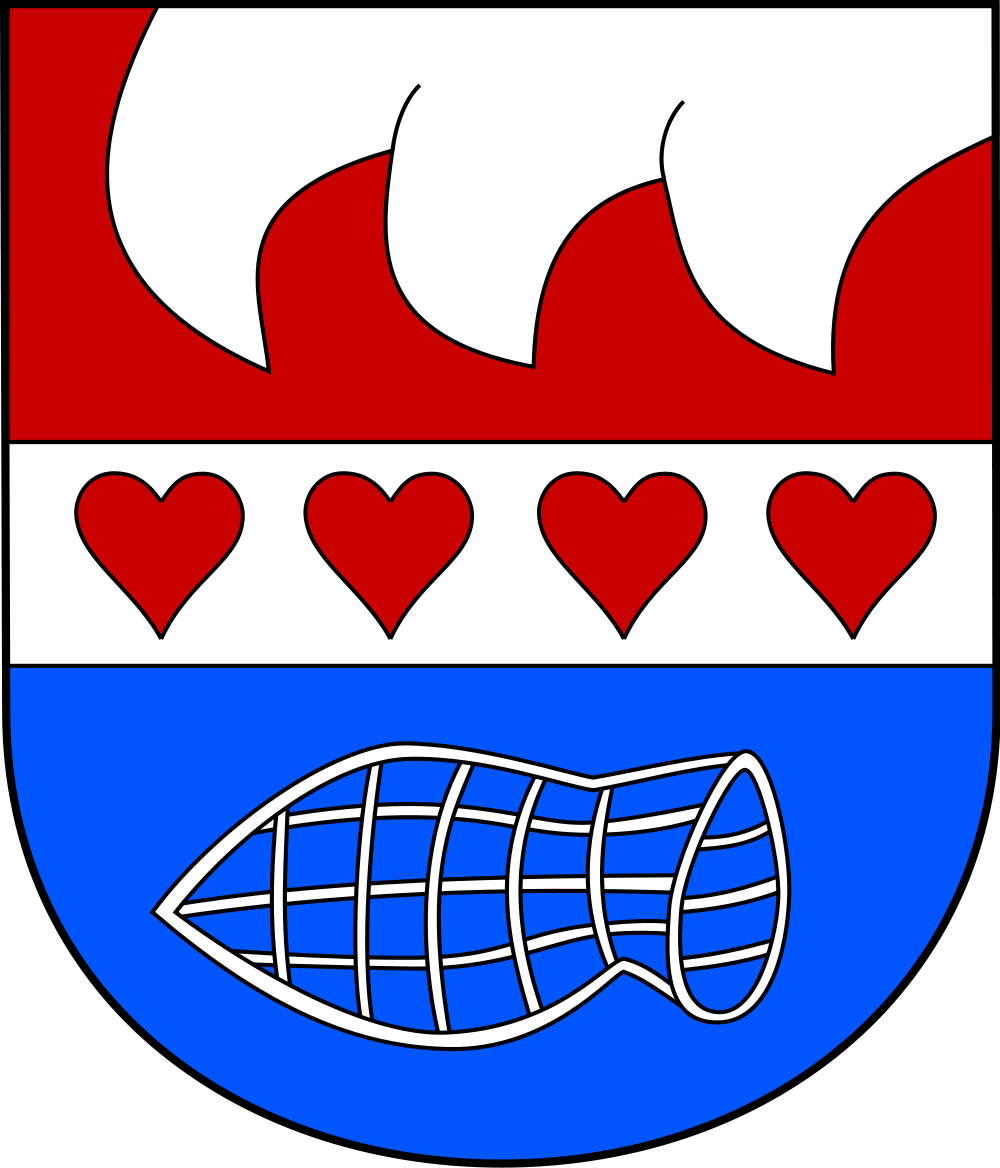 Červeno-modře stříbrným břevnem dělený štít, v něm čtyři červená srdce, nahoře tři stříbrné vlčí zuby vynikající z horního okraje štítu, dole položená stříbrná vrš.