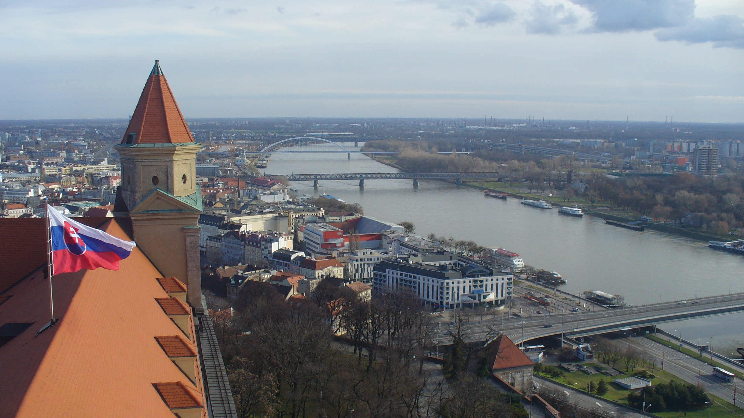 Fotografie + Bratislava (Pressburg, Pozsony) - view from Crown Tower (Bratislava Castle) on town and Donau, prosinec 2007 + pochází z Wikimedia Commons, kde má status – Svobodné licence GNU pro dokumenty verze 1.2 (autor: Pudelek).