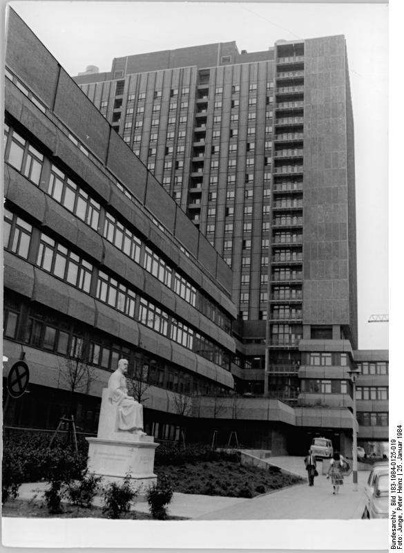 Fotografie + Original caption: Berlin, Krankenhaus, Charité, Robert-Koch-Denkmal ADN-ZB Junge 25.1.84 J-erd-Berlin: Aus dem Neubau des Universitätsklinikums Charité - Blick auf das im Juni 1982 übergebene neue Universitätsklinikum von der Hermann-Matern-Straße aus. Das 21geschossige Hochhaus enthält 15 Pflegeetagen mit jeweils zwei Pflegestationen für insgesamt ca. 1156 Patientenbetten. Links vorn der Operationstrakt mit 24 Operationssälen. Krankenwagen können auch vor der Rettungsstelle halten, an die eine Unfallpoliklinik angeschlossen ist. Im Vordergrund das im März 1982 wieder aufgestellte, restaurierte Robert-Koch-Denkmal. Es stammt vom Berliner Bildhauer Louis Tuallon (1862-1919) . Das Denkmal war 1916 für den Begründer der modernen Bakteriologie, Professor der Hygiene in Berlin und Direktor des Hygieneinstituts der Medizinischen Fakultät (Charité) enthüllt worden.