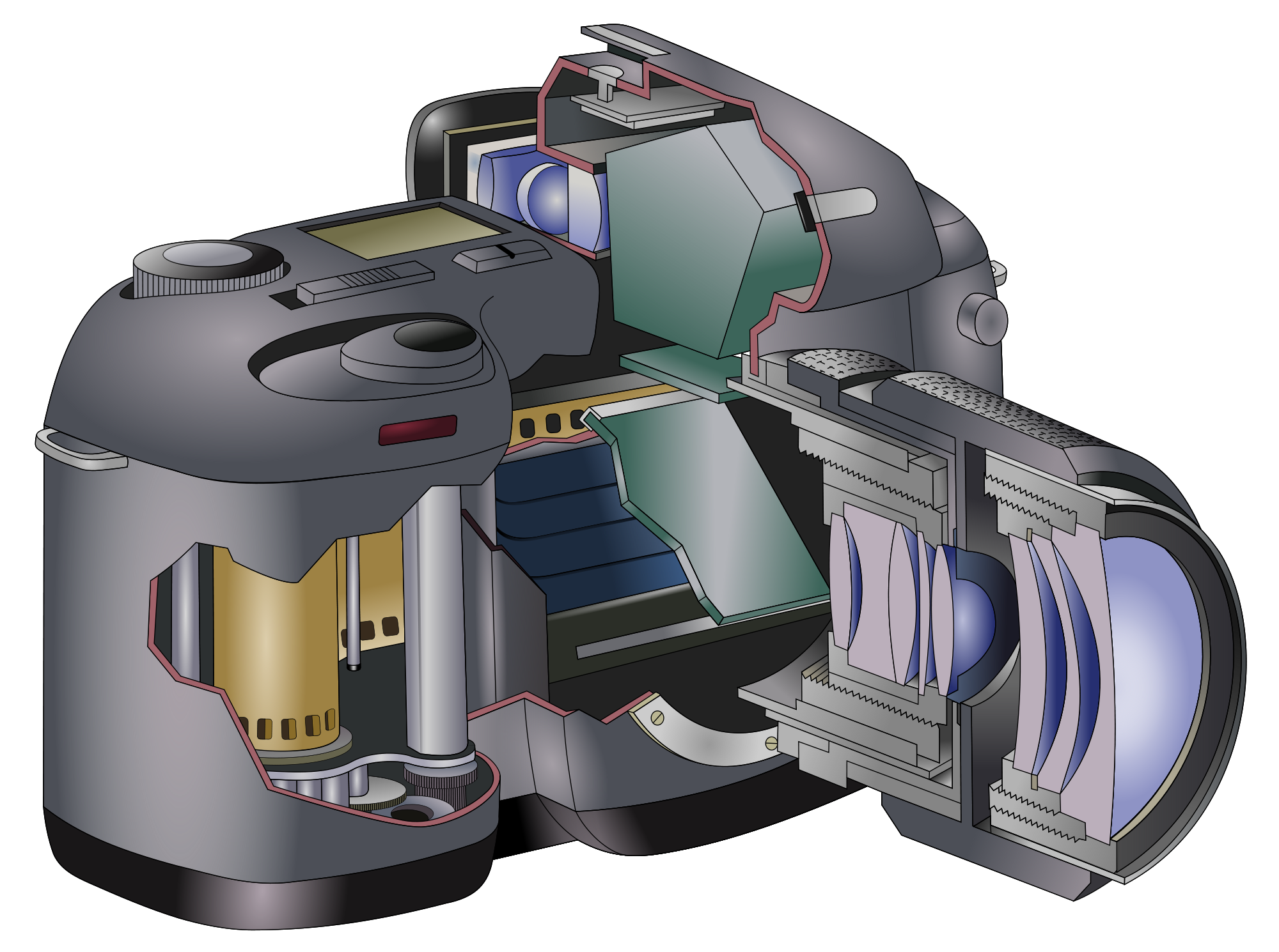 - English: Cross-section view of a single-lens reflex camera (SLR)