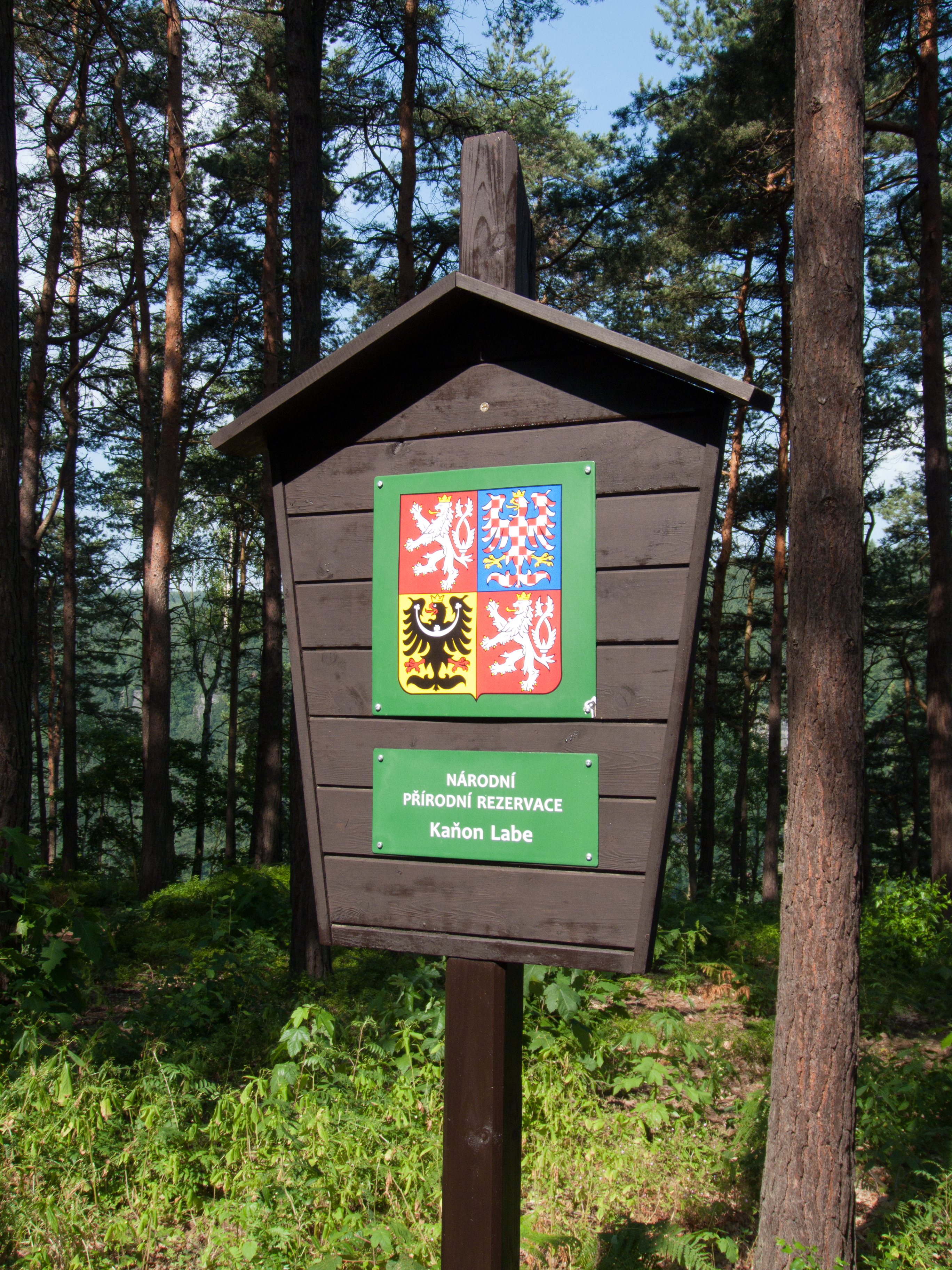 Fotografie + Čeština: Cedule Národní přírodní rezervace Kaňon Labe u vyhlídky Belvedér u obce Labská Stráň, okres Děčín