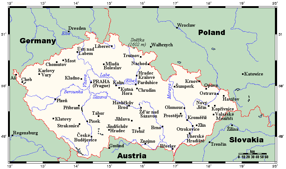 - English: A map showing the Czech Republic's main cities and towns, and nearby areas in neighbouring countries. This map's source is here, with the uploader's modifications, and the GMT homepage says that the tools are released under the GNU General Public License.