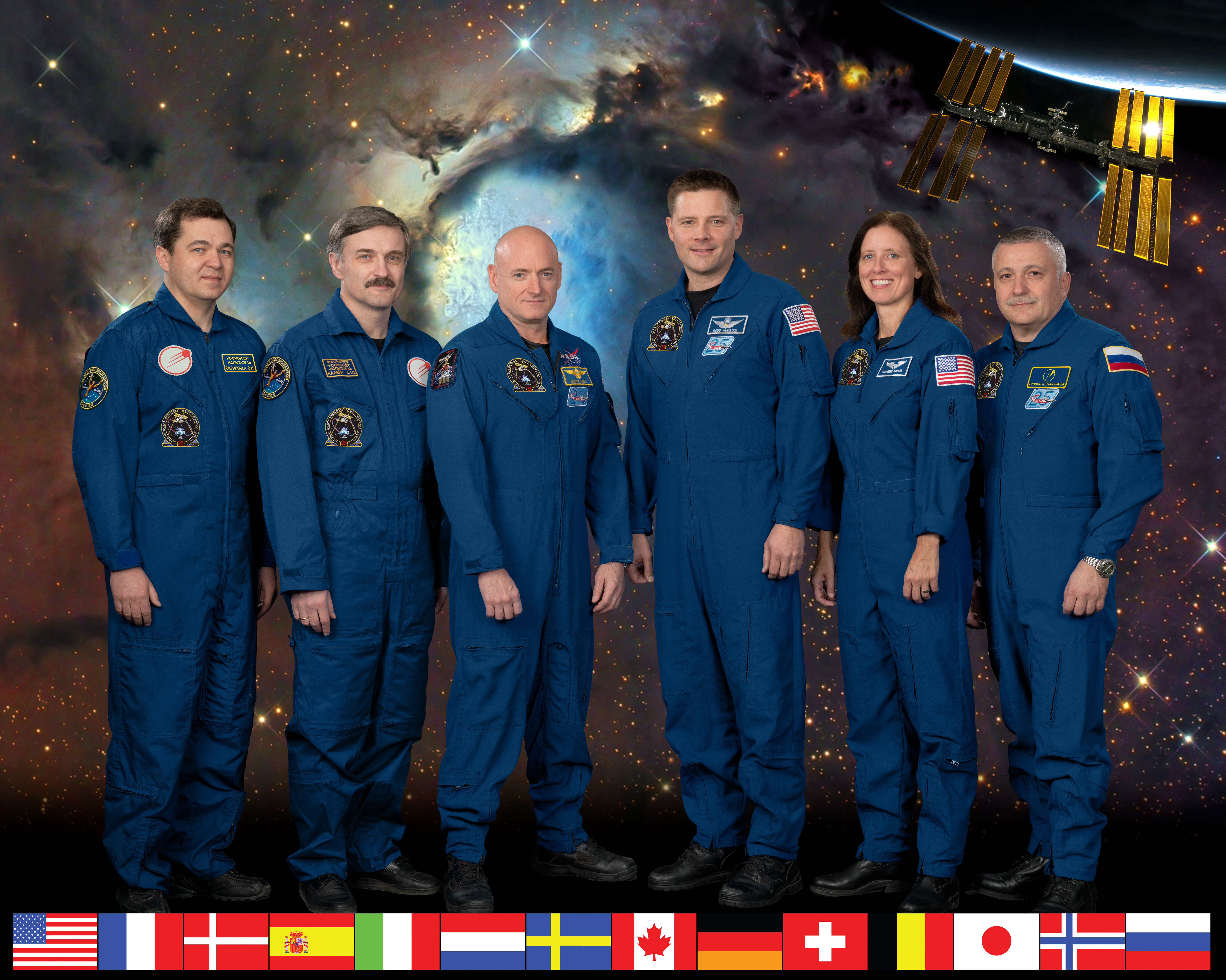 Fotografie + Expedition 25 crew members take a break from training at NASA's Johnson Space Center to pose for a crew portrait. Pictured at center right is NASA astronaut Doug Wheelock, commander. Also pictured (from the left) are Russian cosmonauts Oleg Skripochka and Alexander Kaleri; NASA astronauts Scott Kelly and Shannon Walker; along with Russian cosmonaut Fyodor Yurchikhin, all flight engineers.
