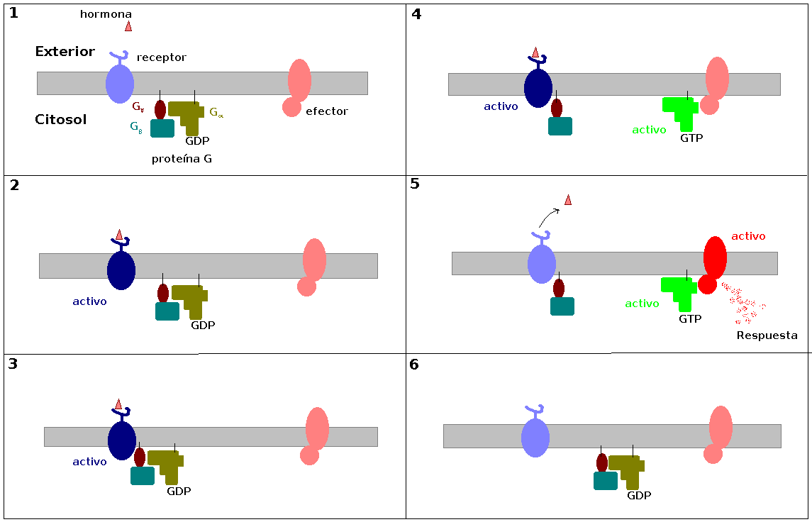 Obrázek + Description: G Protein Activity Cycle; ciclo fisiológico del inicio de cascada de transducción de la señal mediada por un GPCR y una proteína G heterotrimérica.
