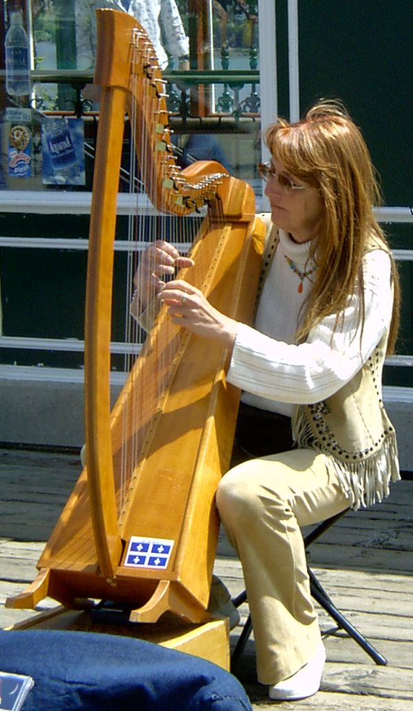 Fotografie + Description: A street musician (a harpist) playing on a boardwalk next to the Chateau Frontenac in Quebec City.