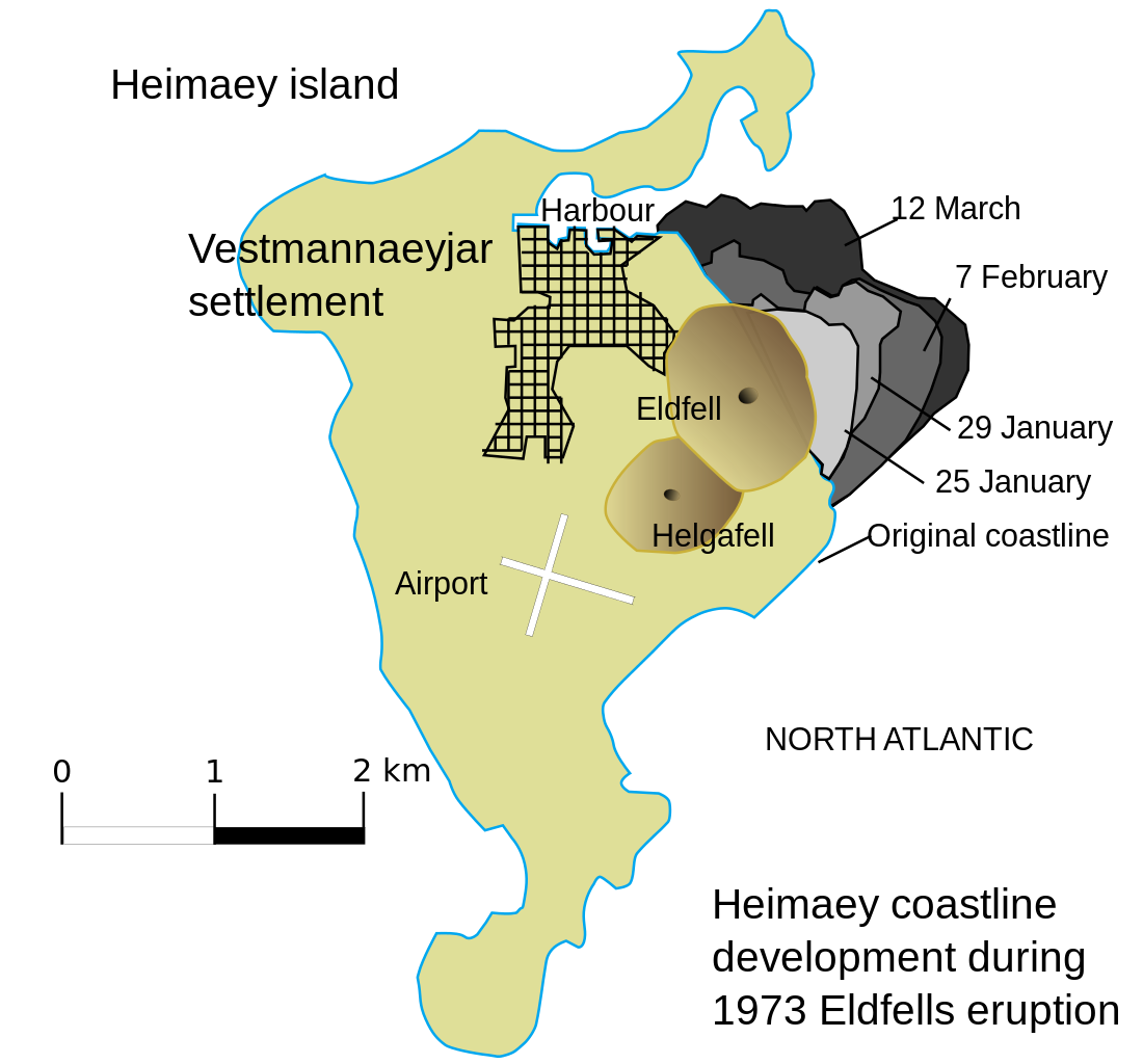 Mapa + Description: The development of the coastline on Heimaey during the eruption of Eldfell 1973, with text in Swedish translated to English.