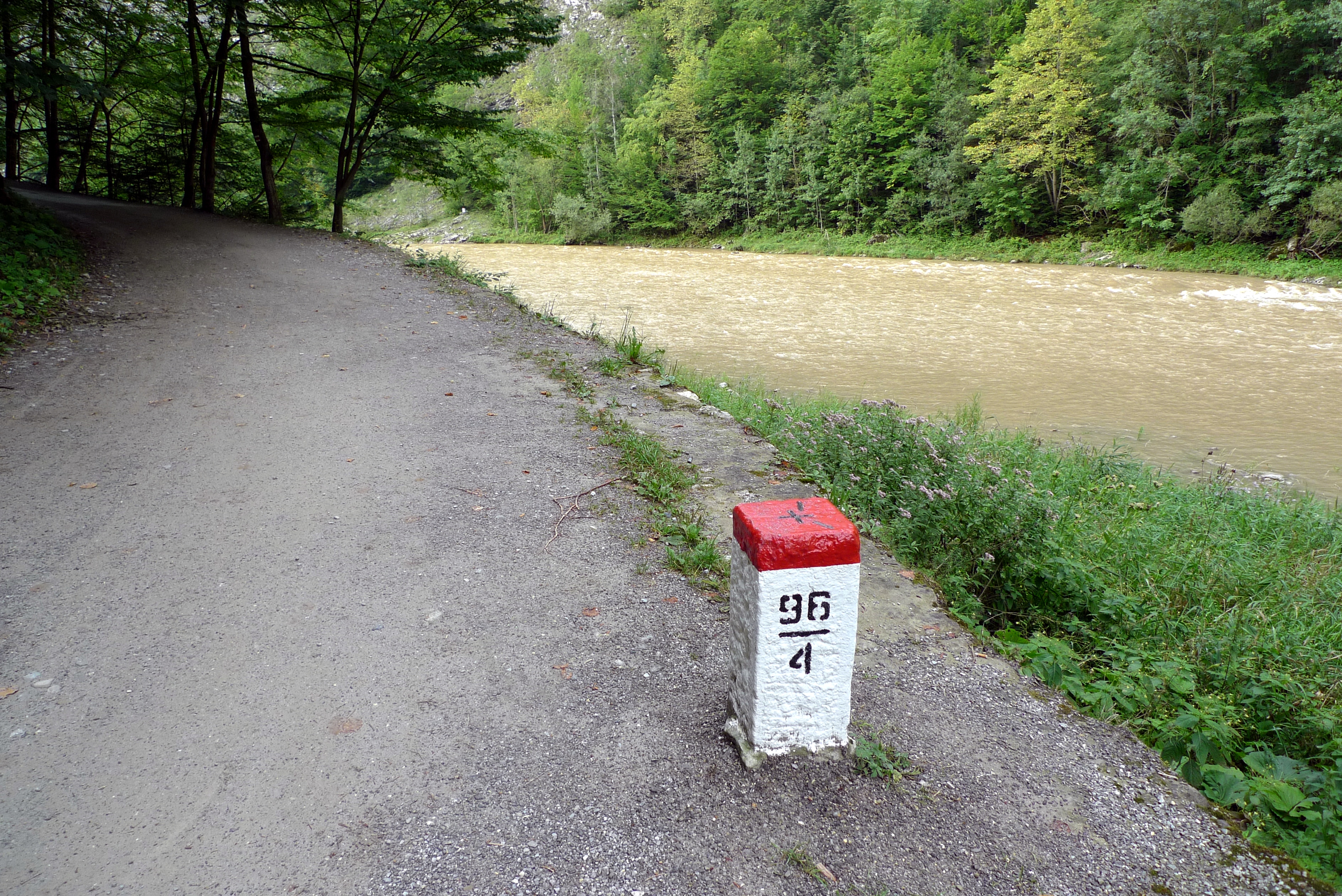 - Polski: Kamień graniczny między Słowacją a Polską obok rzeki Dunajec.