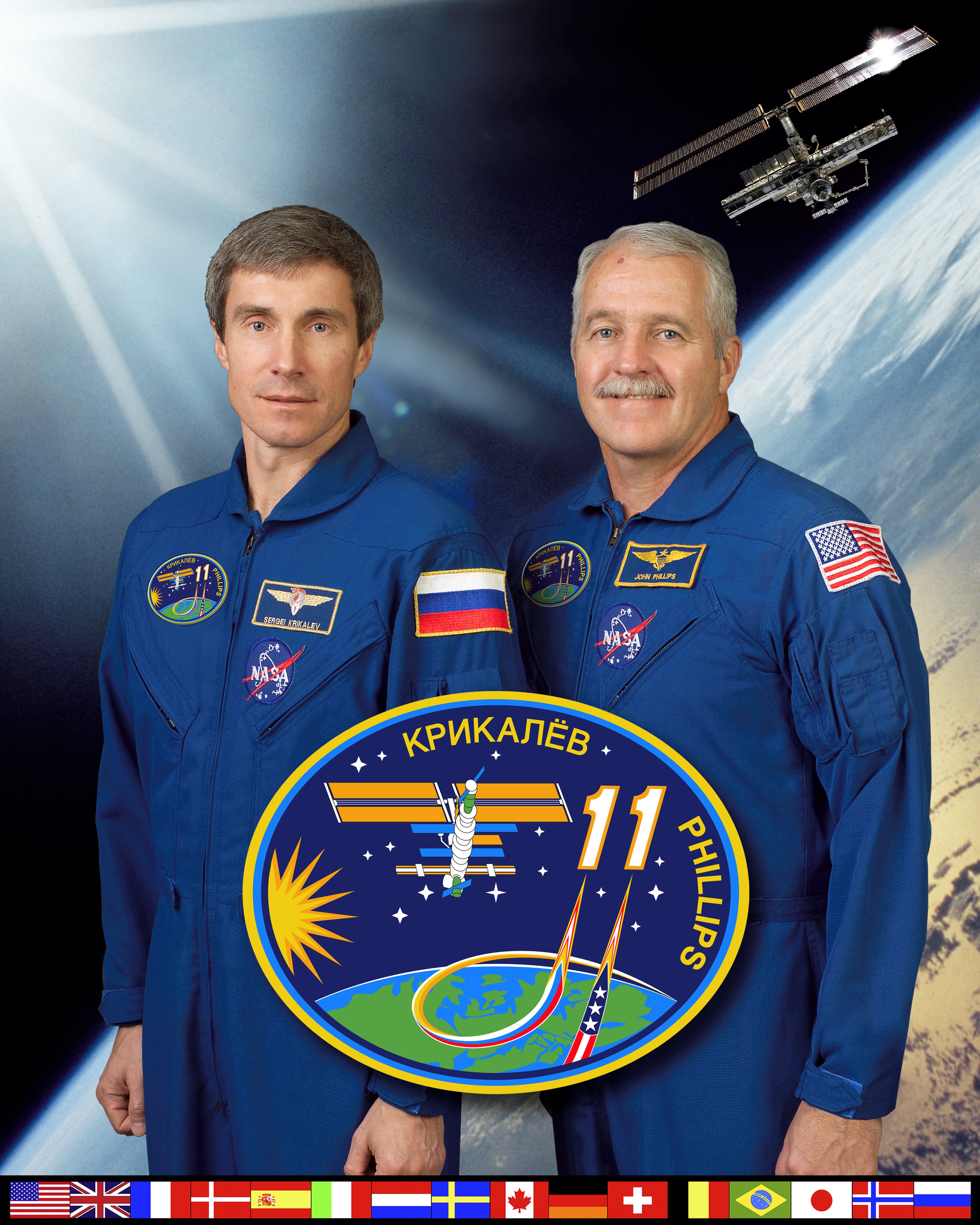Fotografie + ISS011-S-002 (17 February 2005) --- Cosmonaut Sergei K. Krikalev (left), Expedition 11 commander representing Russia's Federal Space Agency; and astronaut John L. Phillips, NASA ISS science officer and flight engineer, pause from their training schedule for a crew portrait at Johnson Space Center (JSC). The two will be launched to the International Space Station (ISS) in early spring of this year in a Soyuz TMA-6 spacecraft.