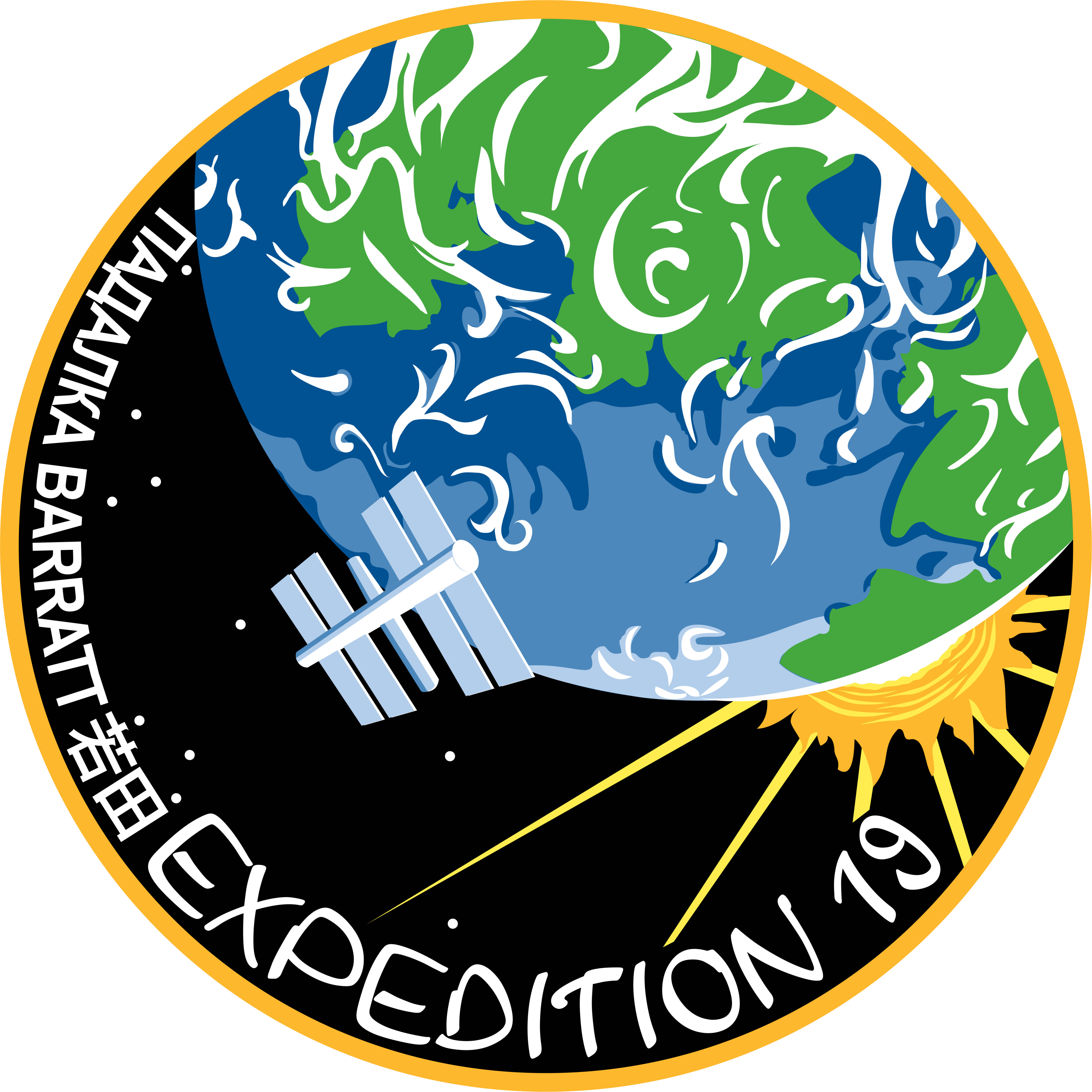 Obrázek + Expedition 19 marks the final planned period of three person occupancy, prior to increasing the crew size to 6, and occurs in the final stages of International Space Station assembly. The patch emphasizes the earth, one of the major focuses of attention and study from the orbital research outpost. The design is stylized to highlight the beauty of the home planet and the station orbiting it, next to the sun now the unquestioned 'brightest star in the sky' as viewed from earth. (prosinec 2008)