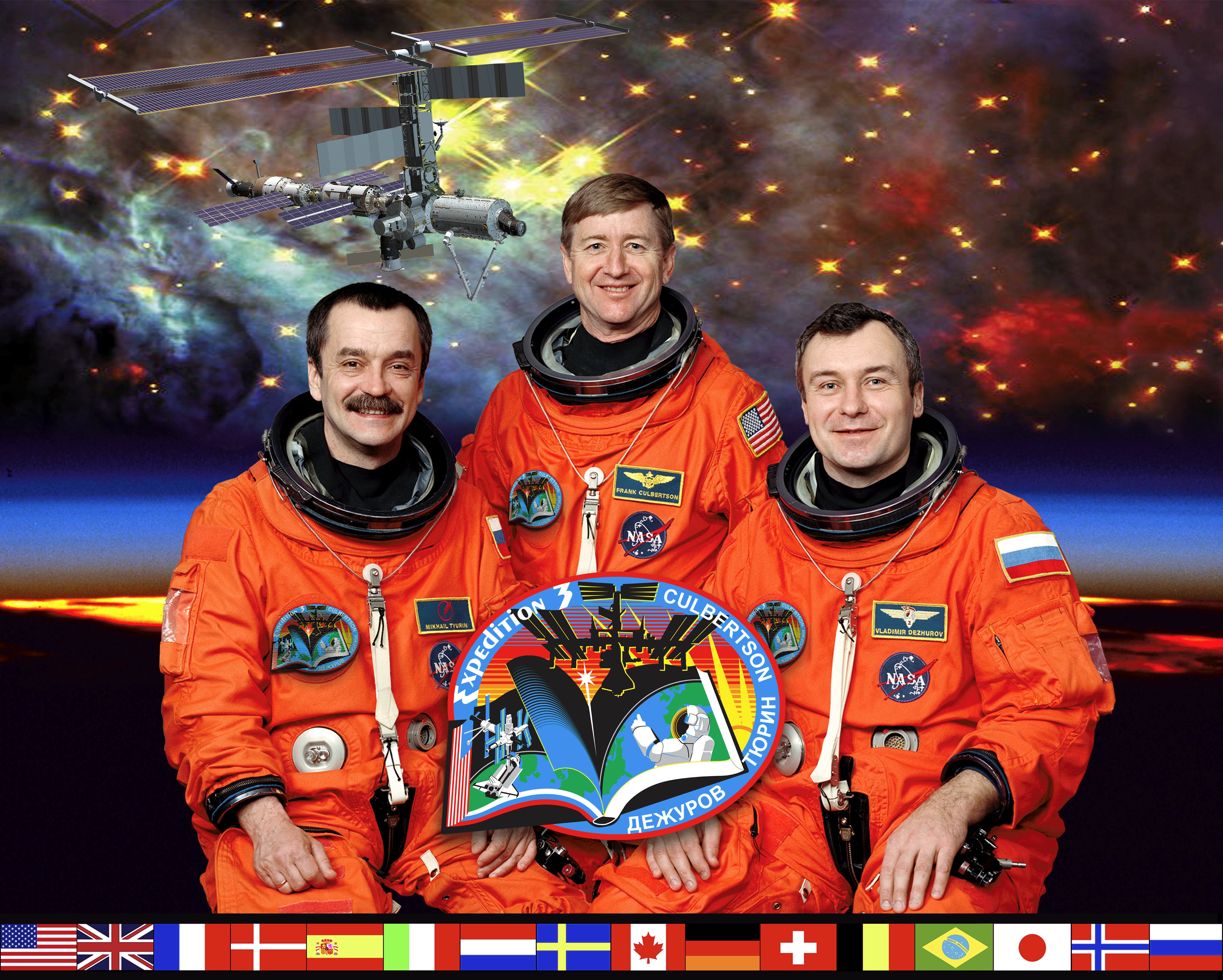 Fotografie + ISS003-S-002 (June 2001) --- Taking a break from a busy training schedule to pose for a portrait are the crew members for Expedition Three, scheduled to replace the current cosmonaut/astronaut trio aboard the International Space Station (ISS). Astronaut Frank L. Culbertson, Jr. (center), commander, is flanked by cosmonauts Mikhail Tyurin (left) and Vladimir Dezhurov, both flight engineers representing Rosaviakosmos. The three will accompany the STS-105 crew into Earth orbit aboard the Space Shuttle Discovery this summer to begin their lengthy stay on the orbital outpost.