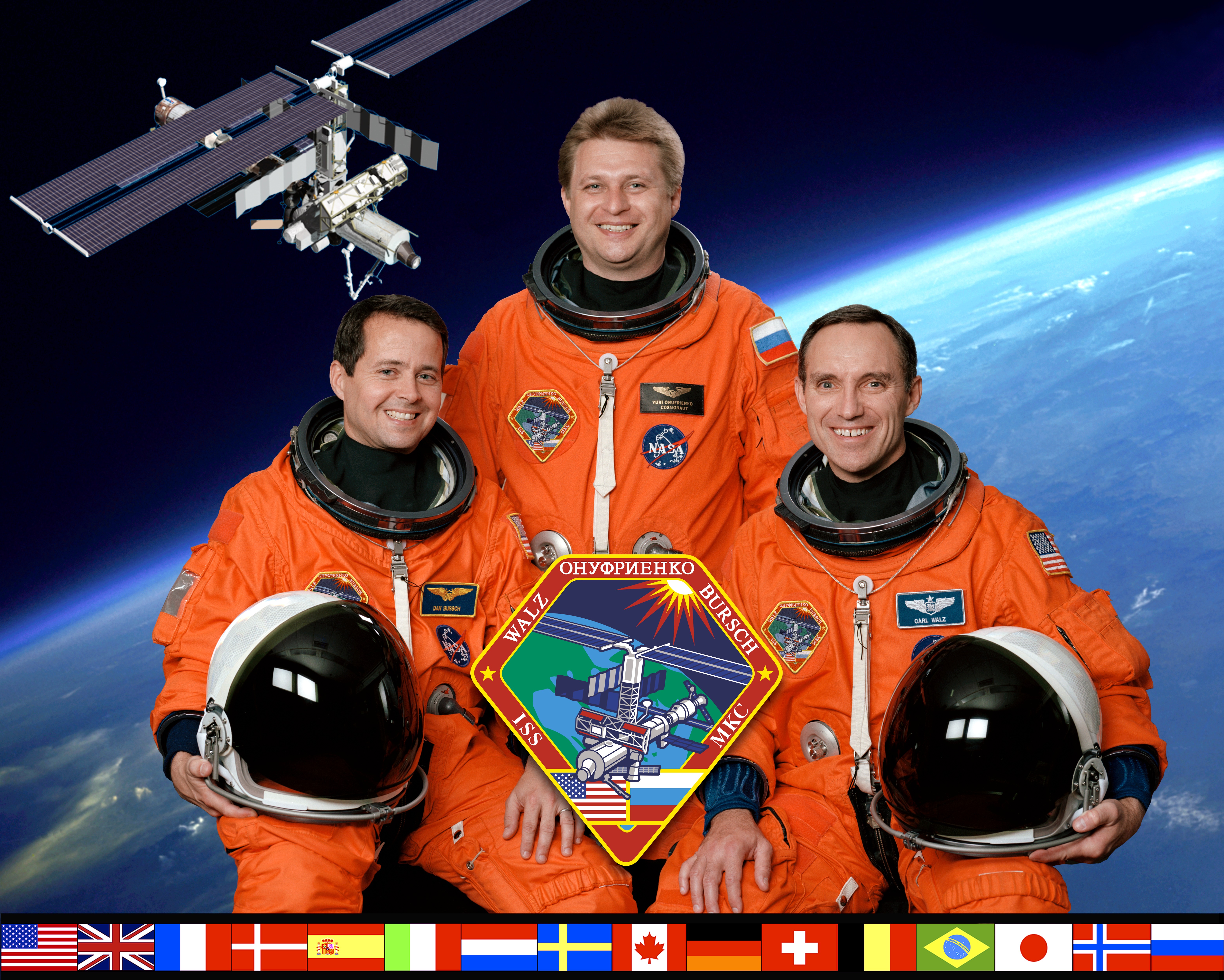 Expedition Four crew members take a break from training for their scheduled upcoming stay aboard the International Space Station (ISS) to pose for the traditional pre-flight crew portrait. Cosmonaut Yuri I. Onufrienko (standing at center), mission commander, is flanked by astronauts Daniel W. Bursch (left) and Carl E. Walz, both flight engineers. The national flags of the International Partners are at the bottom of the portrait. (říjen 2001)