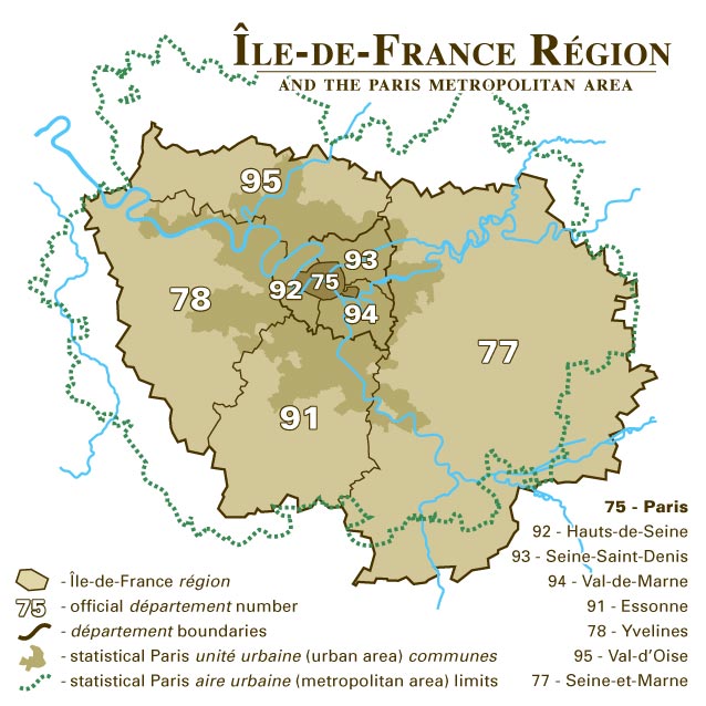 Mapa + English: Plan showing France's Île-de-France région, its departments, petite and grande couronnes