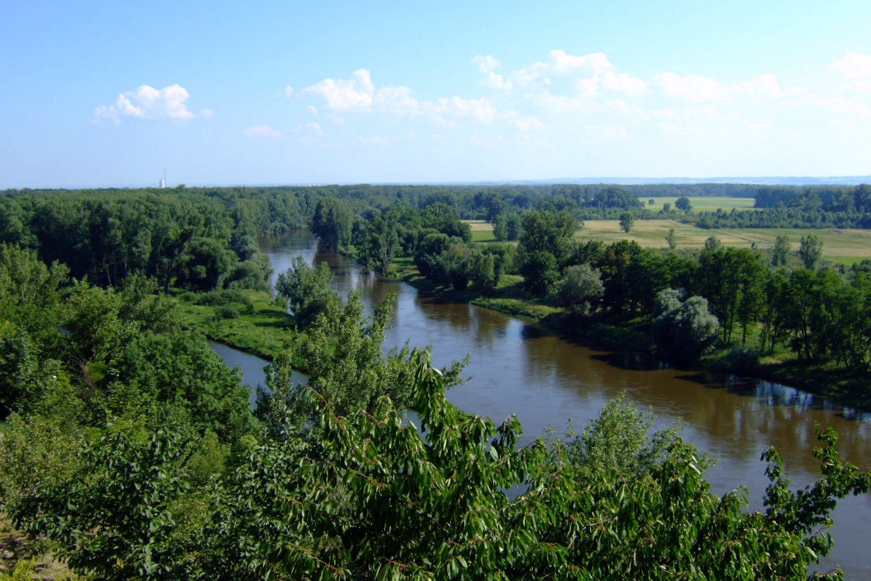 - English: Confluence of the Elbe (left) and Vltava (centre) rivers as seen from Mělník. The floodplain forest between both rivers is protected as Úpor Nature Reserve. Town of Neratovice on the horizon is obscured by the forest. In the right the plain between the Vltava and its navigable lateral canal (out of sight).