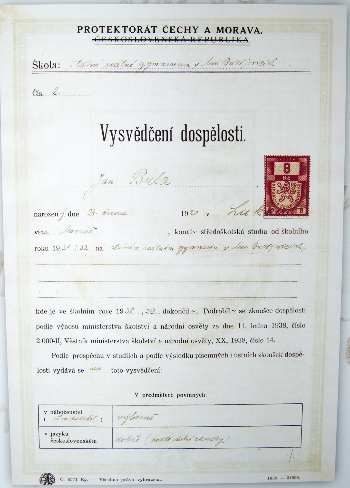 Soubor:Maturitni vysvedceni komunisty popraveneho kneze Jana Buly.jpg